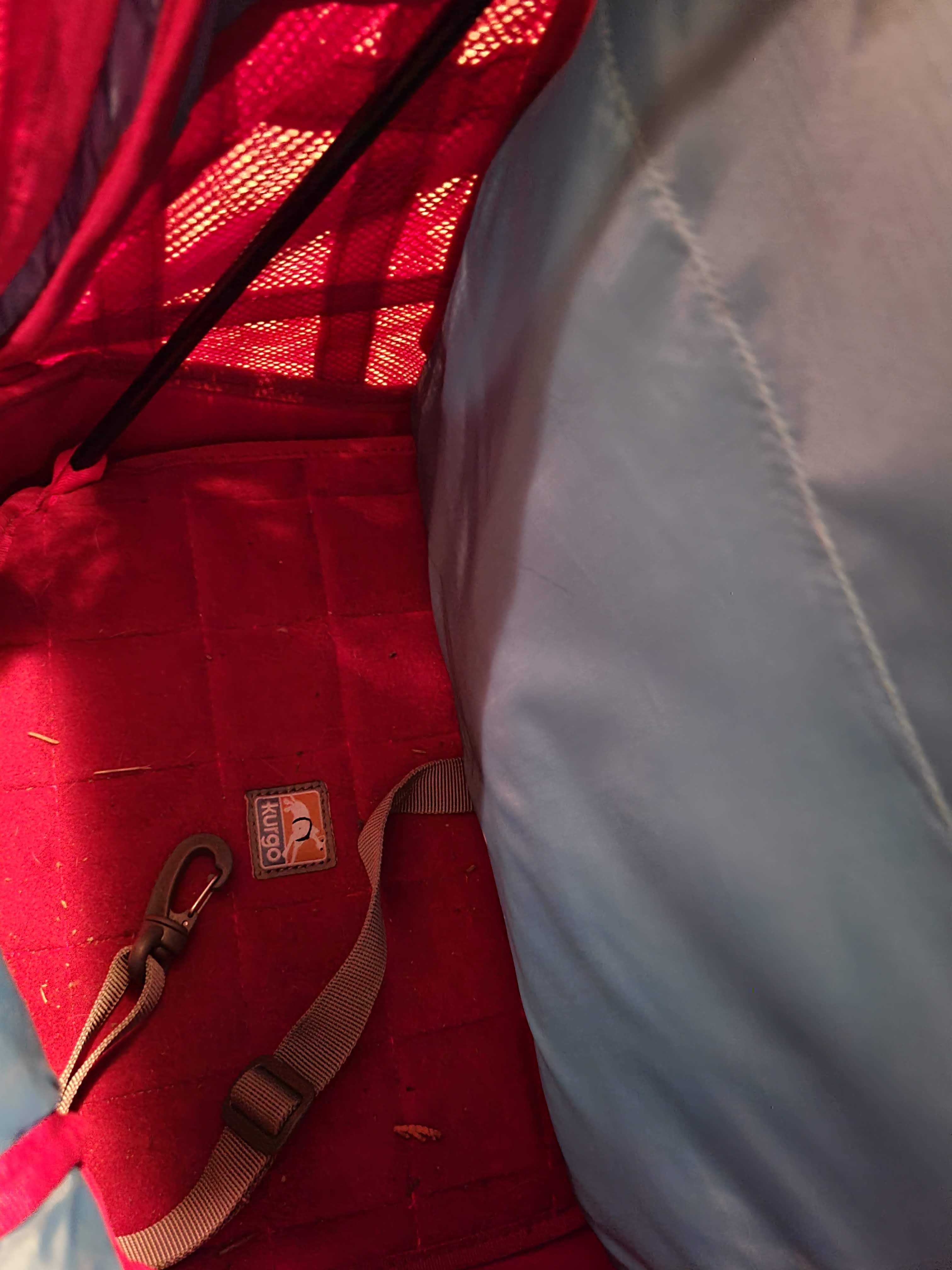 Inside the carrier there are 2 removable plastic stabilizer bars. These bars attach through a loop at bottom front of the base, and a loop about half way up the back on either side. These bars keep the base from flopping up and down. When removed, the base flips up towards the center of the pack for easy storing. These stabilizer bars pop out of place quite a bit, though they still do provide some support the bars slip out of the little loops quite easily. With a smaller dog, a chihuahua or silky terrier size, this may not be such an issue. But a dog over 10lbs is going to provide shift in the base when carried which will move the bars. The weight of Riley kept the base and pack quite stable against my back even without the bars. If the pockets and loops that the bars slid into were a little deeper or if there was a click-lock style system for these stabilizers they may stay in place much better. Overall, they weren’t that big of a deal as the base stays in place without them pretty well.