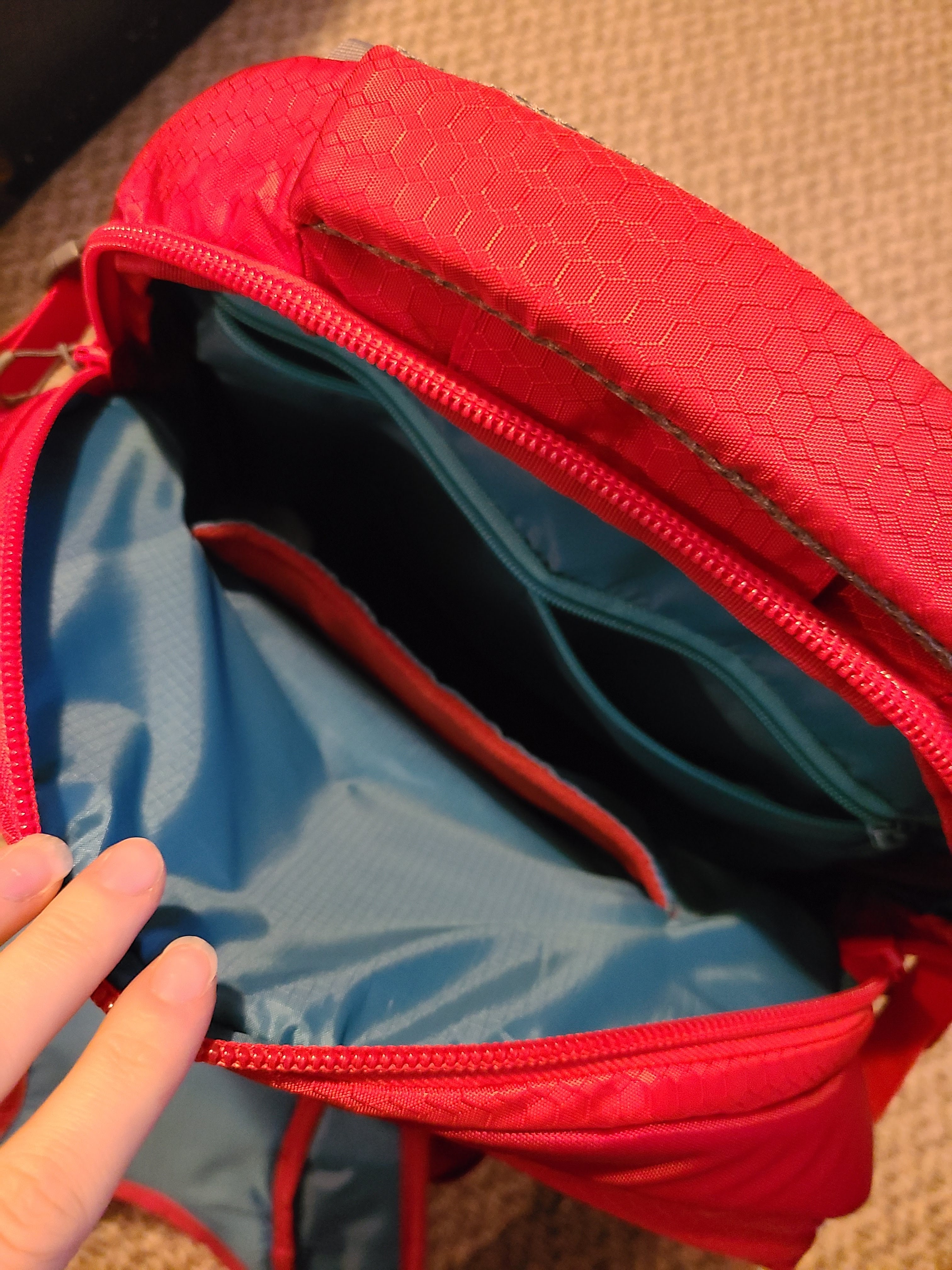 Where the shoulder straps attach to the pack, there is this very handy little pocket that stores the straps when converting the backpack to a duffle carrier, and is perfectly sized for a water bladder! The versatility of this carrier is amazing. It’s no bigger than my standard carry on for flights so it should fit under the seat on most airlines if flights are something else you do with your pup.
